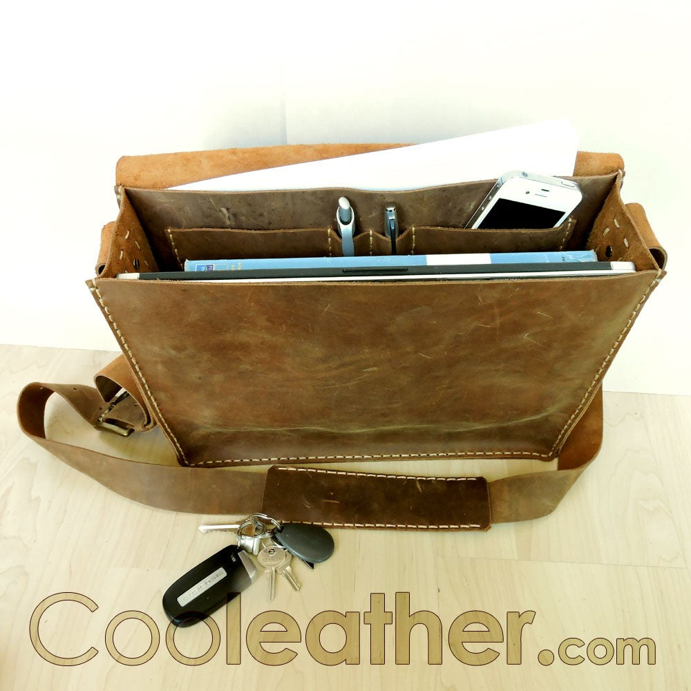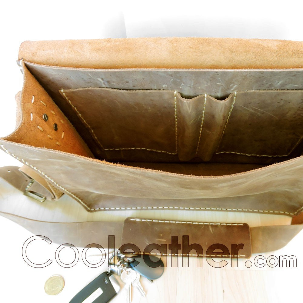 Lovely handmade leather crossbody/shoulder bag, features big inside pocket and extra two smaller pockets for cell phone to other items. It also has two pen sleeves. This bag is 100% handmade and built to last!